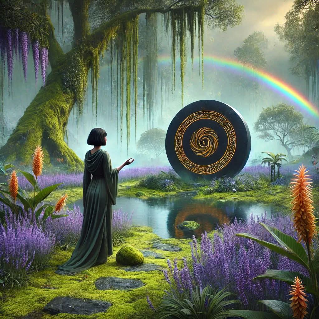 In quel momento dal cielo cominciò a cadere una pioggerellina di un verde tenue. L’intero parco si avvolse in una sottile foschia; lo scorrere della fontana e il cinguettio degli uccellini erano piacevoli all’orecchio. Un arcobaleno di sette colori si stagliava nel cielo, creando uno scenario onirico.