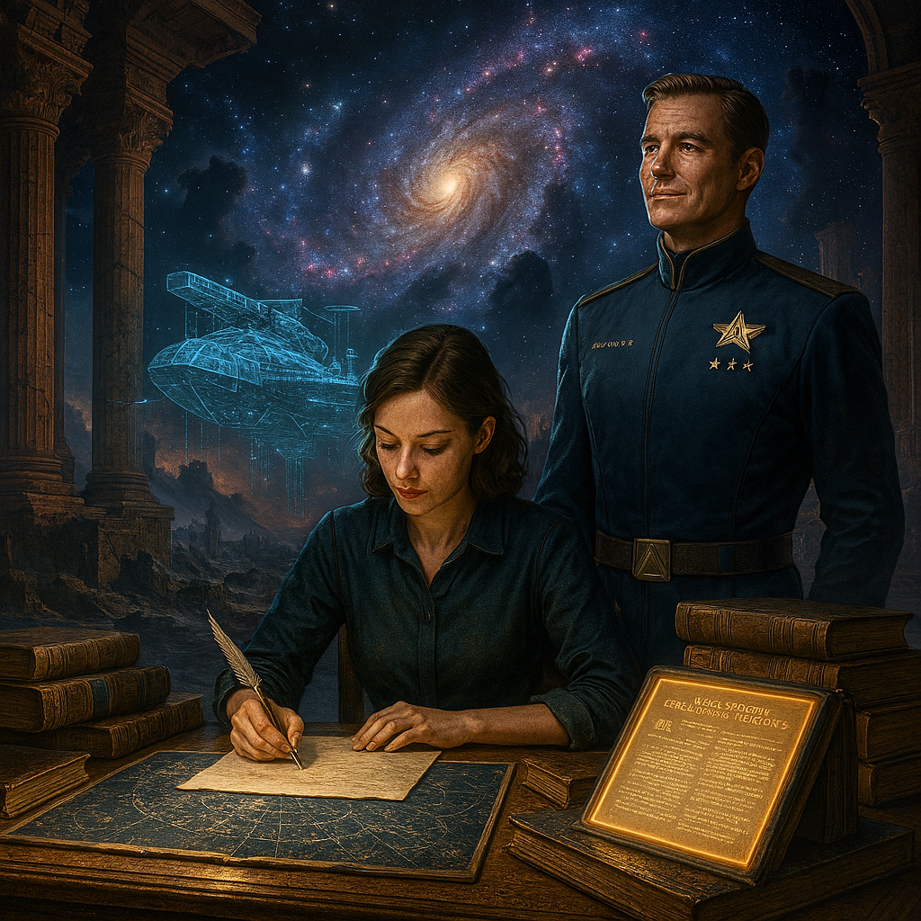 Qui a Smyrno, mio marito ― Byron Farrell ― è sempre pieno di energia. All’inizio era davvero arrogante, persino insopportabile, sai?Ma ormai non posso che definirlo con orgoglio mio marito. È tornato nella flotta come pilota delle Forze Spaziali della Fondazione, e nella riparazione delle navi vanta un’abilità senza pari in tutta la Galassia. È come se avesse inciso la sua anima nelle tre stelle e nell’emblema della nave spaziale.