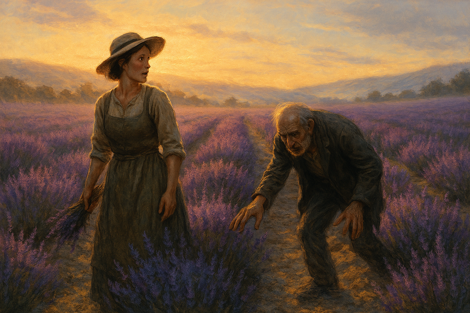 Il sole del mattino illuminava dolcemente i campi di lavanda, mentre nell’aria si diffondeva un profumo soave. Roa lavorava tra i filari, quando all’improvviso notò la figura di un uomo strano. Con la schiena curva, si muoveva come se stesse frugando il terreno: appariva del tutto fuori posto in quel paesaggio rurale.