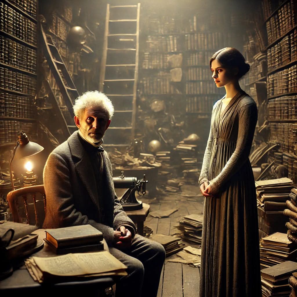 Bayta Mallow spinse la pesante porta ed entrò nella stanza buia e polverosa. Quella era la dimora di Ebling Mis, uno dei massimi psicostorici della Galassia. Le pareti erano interamente ricoperte da scaffali colmi di libri e rotoli antichi, mentre il pavimento era cosparso di documenti, probabilmente i resti di ricerche passate. Al centro di quel caos sedeva uno studioso emaciato.