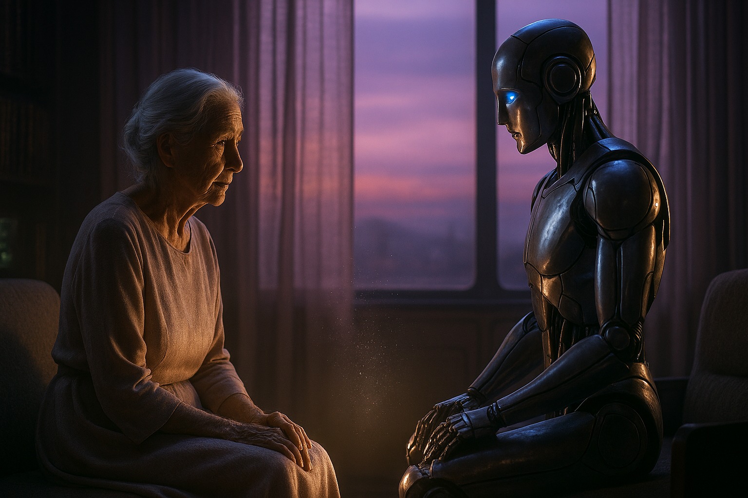 La vecchia Arcadia Darell teneva le mani rugose raccolte in grembo e fissava il robot d’argento che stava davanti all’ologramma.