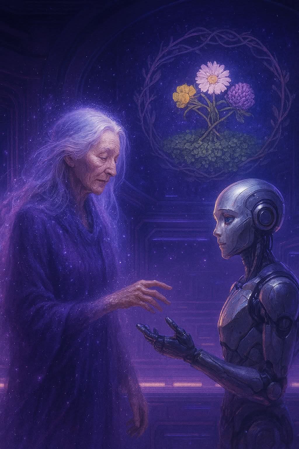 La lunga eco del racconto ondeggiava lievemente nella stanza. Una luce purpurea accarezzava silenziosamente le pareti, avvolgendo la figura di Arcadia in un’aura semitrasparente.